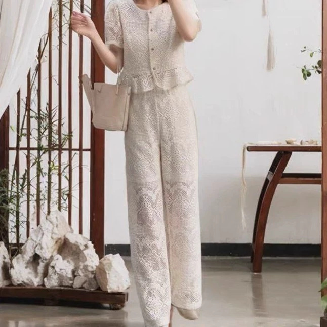 شومیز زنانه خارجی بافت قلاب دوزی استین کوتاه ۵۳۶۸